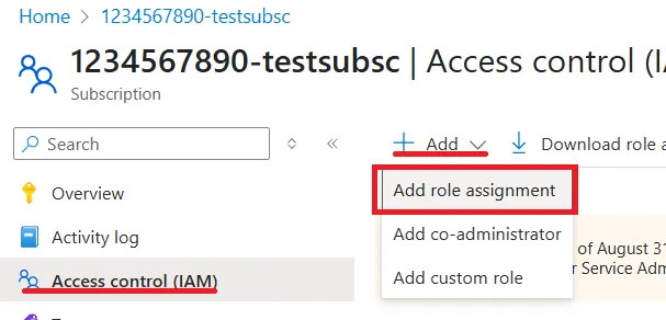 3.Click +Add from the options displayed at the top of the main screen and select Add role assignment.