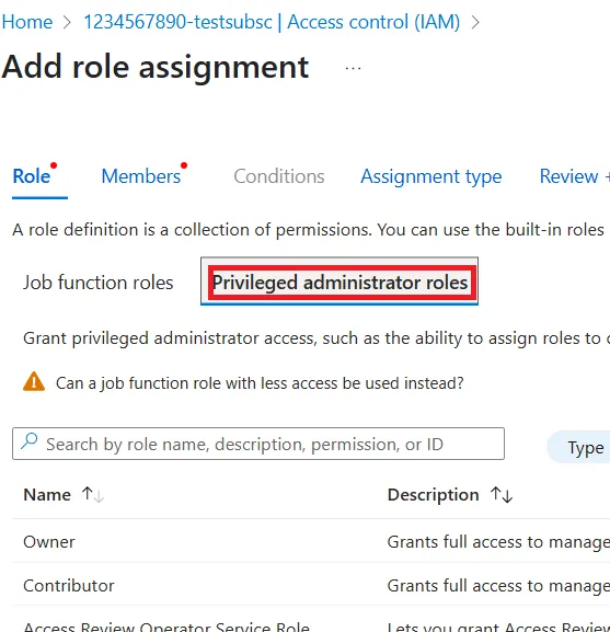 • There are two options, Job Function Role and Privileged Administrator Role, so select Privileged Administrator Role.