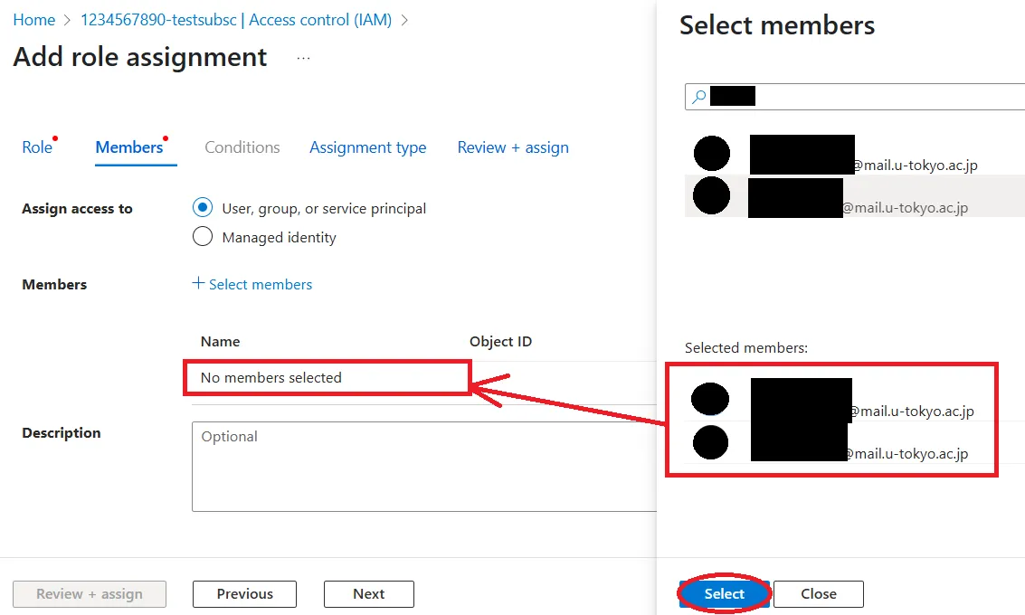 • Members:Click + Select Members, and a search and selection screen for the accounts to which you want to grant permissions will appear on the right side of the screen. Narrow your search criteria to find and select the accounts to which you want to grant permissions. Finally, click Select at the bottom of the selection screen, and the selected members will be displayed on the main screen.