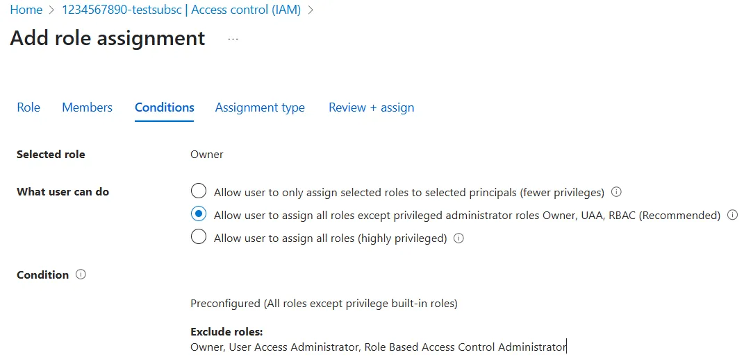 • Typically you would select Allow user to assign all roles except privileged administrator roles Owner, UAA, RBAC (Recommended).