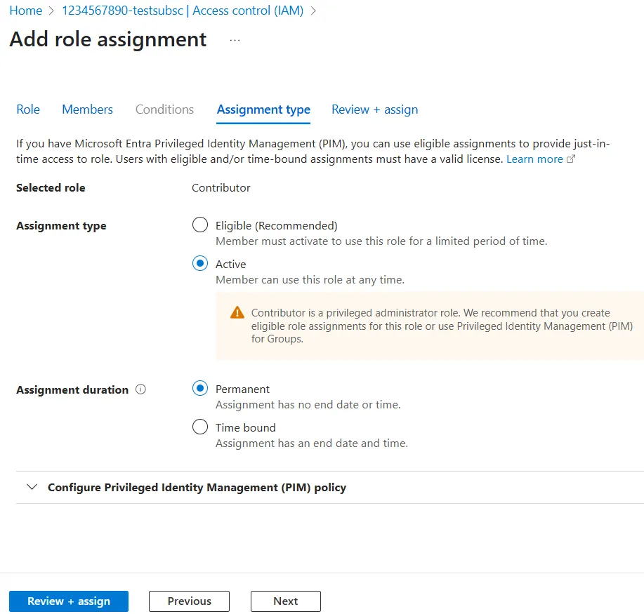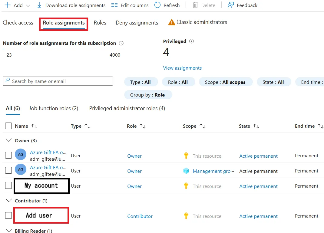 Follow the steps below to assign roles to each scope. We will show the steps for Contributor here, but the steps are the same for Owner (with some additional steps), so please read them accordingly when assigning owners.