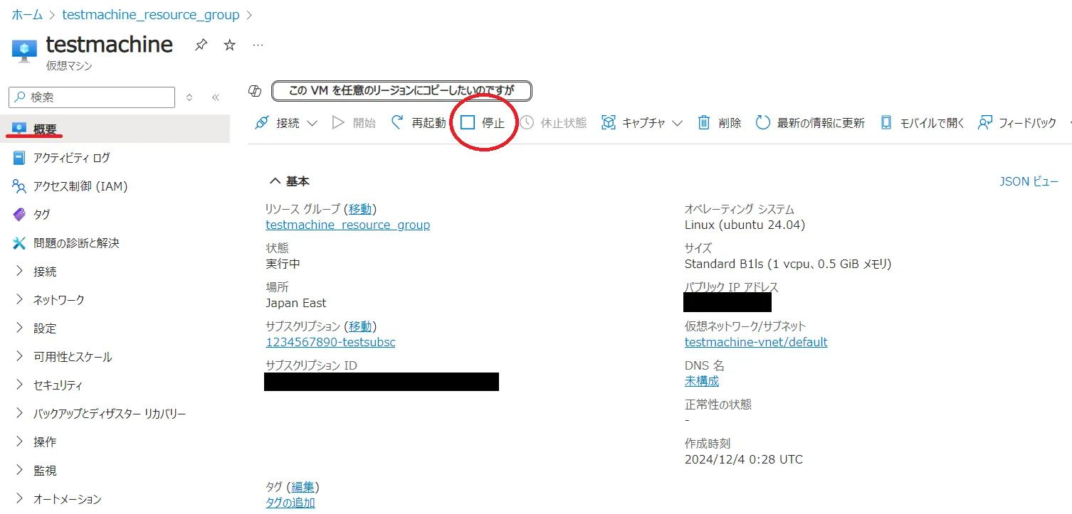 - 仮想マシンリソースの詳細で上部に、