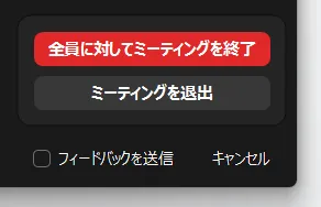 ホストが進行中のミーティングを退出する場合,以下のように「全員に対してミーティングを終了」と「ミーティングを退出」の2つの選択肢が表示されることがあります.