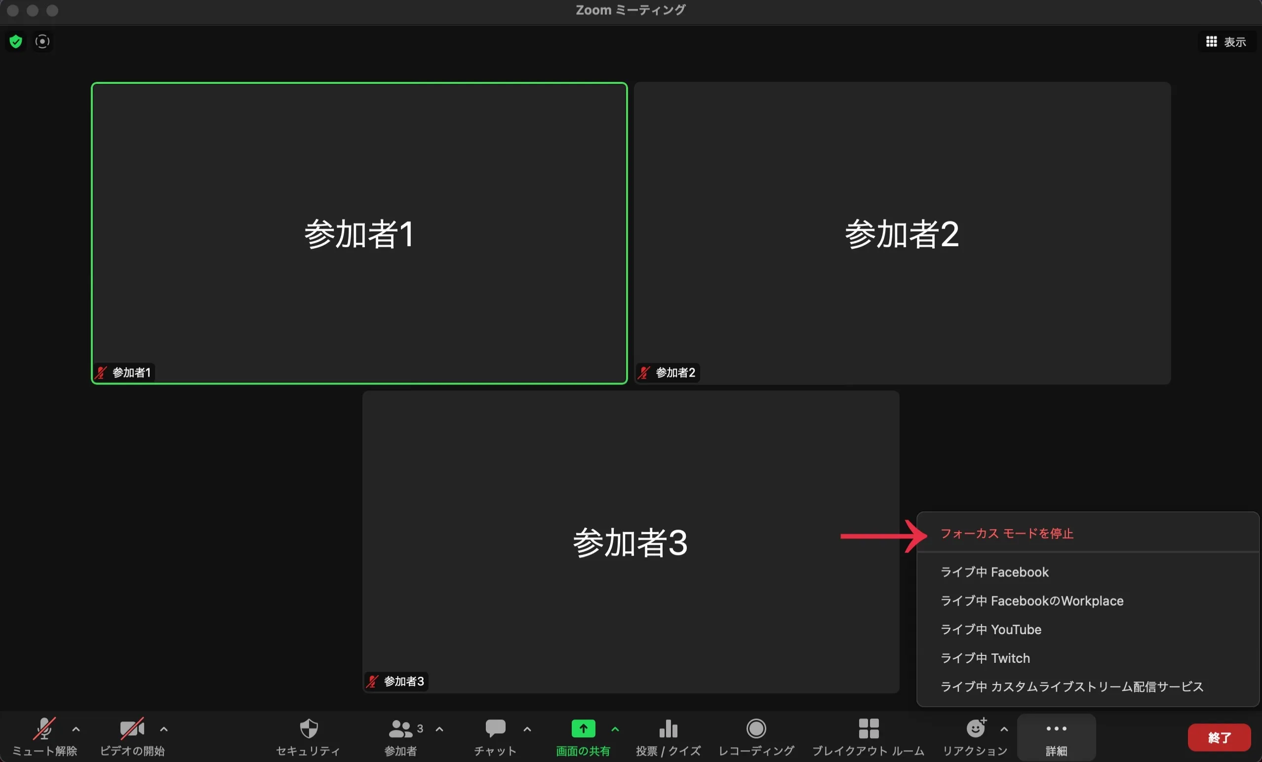 フォーカスモードを終了したい場合,1.の後に表示されたメニューで「フォーカスモードを停止」を押してください.